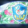 Description: Stained glass window depicting a shield with a swan and a crown, surrounded by roses.